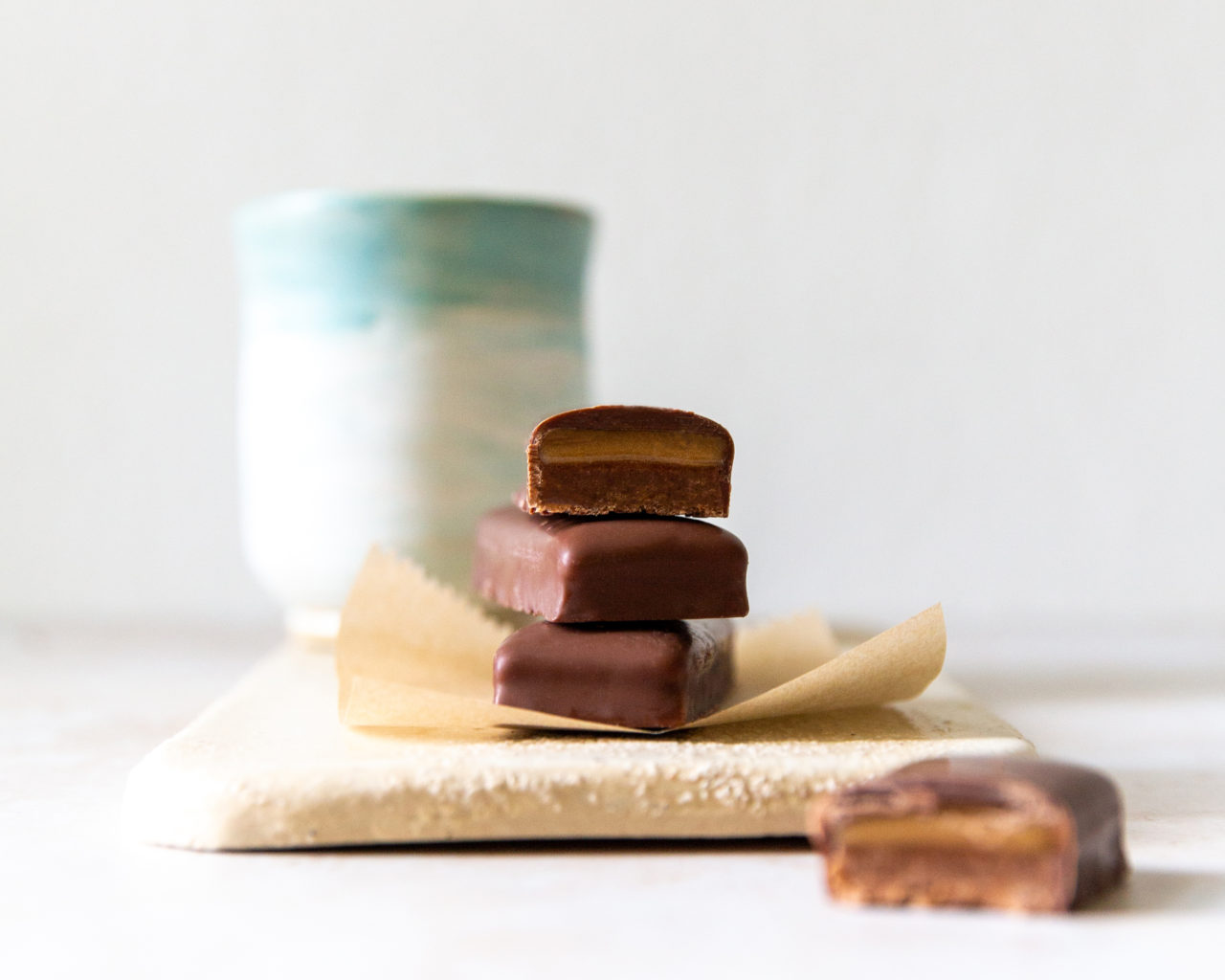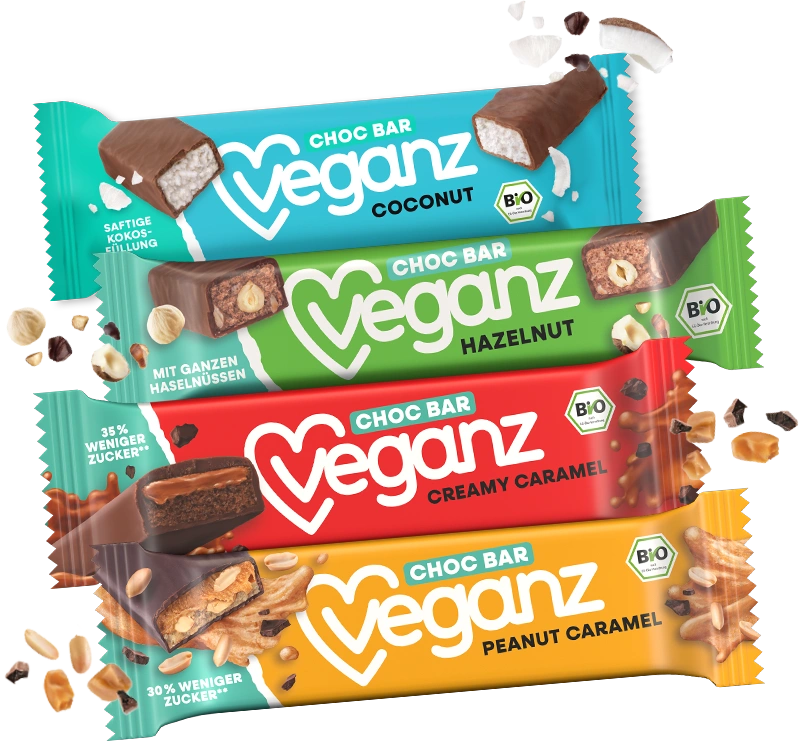 Choc Bar White Coconut Choc Bar Coconut Choc Bar Peanut Caramel Choc Bar Strawberry Choc Bar Hazelnut Choc Bar Creamy Caramel Eine saftige Kokosfüllung und die knackige weiße Kakaohülle machen diese Special Edition zu dem beliebtesten Snack der Saison. Der vegane Schokoriegel kann aber noch mehr als unfassbar lecker sein: Denn er ist in Partnerschaft mit der Tierschutzorganisation PeTA offizieller Affen-Schützer, mit einer Papierverpackung extra nachhaltig und hat über 20% weniger Zucker als vergleichbare Riegel. Und – schon verknallt? Nährwerte Durchschnittliche Nährwerte je 100 g Brennwert 2454 kJ 591 kcal Fett 44 g - davon gesättigte Fettsäuren 34 g Kohlenhydrate 42 g - davon Zucker 36 g Eiweiß 2.8 g Salz 0.15 g Zutaten Kokosraspel* (37%), Rohrzucker*, Kakaobutter* (21%), Inulin*, Reisglukosesirup* getrocknet, Emulgator: Sonnenblumenlecithine*; Meersalz. *aus kontrolliert biologischem Anbau. Kann Spuren von SCHALENFRÜCHTEN und MILCH enthalten. Nachhaltig Liebe fürs Klima Ganz transparent: Das ist der Fußabdruck vom Bio Veganz Choc Bar White Coconut Weil uns von Veganz Tierwohl in Form von veganen Produkten nicht genug ist, haben wir eine enge Partnerschaft mit PeTA – und mit unserem Choc Bar White Coconut unterstützt du deren Initiative zum Schutz von Affen. Denn bei der Kokosnuss-Ernte werden vor allem in Thailand häufig Affen unter schrecklichen Bedingungen zum Arbeiten gezwungen. Wir achten ganz genau darauf, dass die Kokosnüsse aus Sri Lanka für unseren Riegel ohne den Einsatz von Affen geerntet werden und unterstützen mit jedem verkauften weißen Kokosriegel PeTAs Initiative. Und weil der Schutz von Umwelt und Klima eines unserer größten Anliegen ist, geben wir immer unser Bestes, unsere Produkte so nachhaltig wie möglich zu gestalten. Und damit das für dich nachvollziehbar ist, zeigen wir auf jedem Produkt einen detaillierten Eaternity-Score mit dem ökologischen Fußabdruck . Dieser fällt bei unserem Helden, dem veganen weißen Kokosriegel, sehr gut aus – denn in 3 von 4 Kategorien gibt es hier Bestnoten. Tierwohl, Regenwaldschutz und auch CO2-Verbrauch sind bei dem Riegel eine ganze Ecke besser als bei vergleichbaren Produkten. Nur der Wasserverbrauch ist leider zu hoch – das liegt vor allem an den Zutaten Kakao und Kokos, die sehr viel Wasser benötigen. Und nach dem Naschen? Da kannst du die Verpackung des veganen Kokosriegels ganz einfach über das Altpapier recyceln – denn diese besteht zu 100 % aus Papier und ist damit komplett plastikfrei. Aber keine Sorge, dein Riegel ist trotzdem sicher: Denn die innovative Verpackung aus Frischfaserzellstoff hat eine Funktionsschicht, die den Riegel vor Umwelteinflüssen wie Sauerstoff oder Fett schützt. DevStage Der Bio Veganz Choc Bar Creamy Caramel ist ein Schokoriegel wie aus dem Bilderbuch: Ein flüssiger Karamellkern trifft in ihm auf eine unvergleichlich softe Candycreme. Das Ganze wird umhüllt von knackiger veganer Milchschokolade. Lecker? Mega lecker! Und außerdem komplett pflanzlich, bio und ohne Palmöl. Nährwerte Durchschnittliche Nährwerte je 100 g Brennwert 1913 kJ 457 kcal Fett 21 g - davon gesättigte Fettsäuren 9.8 g Kohlenhydrate 55 g - davon Zucker 39 g Eiweiß 9.9 g Salz 0.82 g Zutaten Reissirup*, Rohrzucker*, Kakaobutter*, Agavendicksaft*, Reisprotein*, Kakaomasse*, Sonnenblumenprotein*, MANDELN*, Sonnenblumenöl*, Tapiokaextrakt*, Dattelsirup*, Emulgator: Sonnenblumenlecithine*; Vanilleextrakt*, Salz, Aroma*. *aus kontrolliert biologischem Anbau. Kann Spuren von ERDNUSS, SOJA, anderen SCHALENFRÜCHTEN, SESAM, GLUTENHALTIGEM GETREIDE, EI und MILCH enthalten. Nachhaltig DevStage DevStage DevStage 🛈 Hier erhältlich REWE | DE kokku-online.de | DE Velivery Globus | DE Müller | DE Coop | CH Budni | DE Spar | SI Amazon Fresh Vekoop | DE tegut | DE Carrefour | BH OS World of Sweets | DE Mehr zeigen Endlich: den Klassiker aus dem Schokoriegel-Regal gibt’s jetzt auch in vegan! Der Veganz Choc Bar Peanut Caramel versüßt jede Pause mit cremigem Caramel, knackigen Erdnüssen und einer zartschmelzenden Schokoladenhülle – und das ganz ohne tierische Zutaten. Nicht nur für Naschkatzen: Mit ganzen 17 Gramm Protein auf 100 Gramm ist der vegane Schokoriegel als Proteinquelle auch ideal als Snack nach dem Workout geeignet. Nährwerte Durchschnittliche Nährwerte je 100 g Brennwert 1982 kJ 474 kcal Fett 24 g - davon gesättigte Fettsäuren 7.6 g Kohlenhydrate 44 g - davon Zucker 32 g Eiweiß 17 g Salz 0.75 g Zutaten Reissirup*, ERDNÜSSE*, Rohrzucker*, Kakaomasse*, Reisprotein*, Sonnenblumenprotein*, Agavendicksaft*, Sonnenblumenöl*, Kakaobutter*, Salz, Emulgatoren: Sonnenblumenlecithine*, SOJALECITHINE*. *aus kontrolliert biologischem Anbau. Kann Spuren von SCHALENFRÜCHTEN, SESAM, GLUTENHALTIGEM GETREIDE, EI und MILCH enthalten. 🛈 Hier erhältlich Lidl | CH REWE | DE kokku-online.de | DE Velivery Globus | DE EDEKA | DE Müller | DE dm | AT Coop | CH Budni | DE Spar | SI Amazon Fresh Vekoop | DE tegut | DE OS World of Sweets | DE MPREIS Italia | IT Mehr zeigen Wir können’s nicht anders ausdrücken – unser Bio Veganz Choc Bar Strawberry ist pure Liebe: Schwebe mit seiner fruchtigen Erdbeer-Mandelcremefüllung auf einer fluffigen rosa Wolke und lass dich von vollmundiger, dunkler Schokoladenkuvertüre verführen. Hach ja, süßer und lieblicher kann ein Schokoriegel wohl kaum sein. Nährwerte Durchschnittliche Nährwerte je 100 g Brennwert 2149 kJ 518 kcal Fett 35 g - davon gesättigte Fettsäuren 14 g Kohlenhydrate 35 g - davon Zucker 34 g Eiweiß 7.3 g Salz 20 mg Zutaten Rohrzucker*, MANDELN* (26 %), Kakaobutter*, Inulin*, Kakaomasse*, Erdbeerstückchen* gefriergetrocknet (3,5 %), Zitronenpulver*, Emulgator: Sonnenblumenlecithine*; natürliche Aromen. *aus kontrolliert biologischem Anbau. Kann Spuren von anderen SCHALENFRÜCHTEN und MILCH enthalten. Nachhaltig DevStage 🛈 Hier erhältlich Kaufland | SK AEZ / HIT | DE REWE | DE kokku-online.de | DE EDEKA | DE Müller | DE
