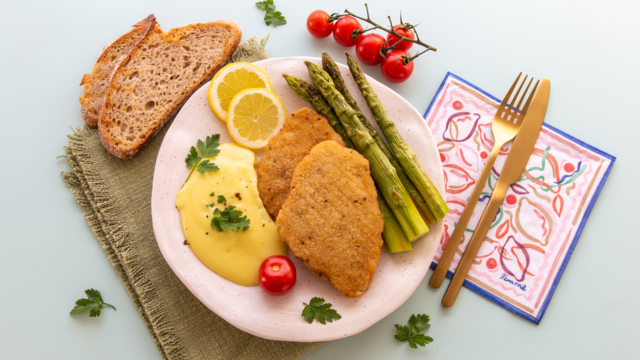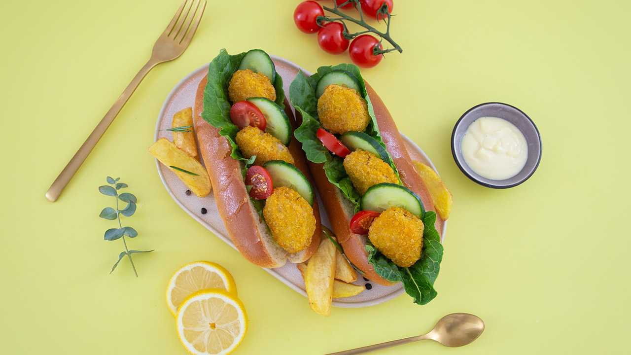 Wasser, PANIERMEHL (WEIZENMEHL, Salz, Hefe), Sonnenblumenöl, Maisöl, WEIZENPROTEIN (7,2 %), WEIZENMEHL, WEIZENSTÄRKE, modifizierte WEIZENSTÄRKE, natürliches Aroma, Zuckerrohrfasern, Erbsenproteinisolat, Verdickungsmittel: Methylcellulose; Maisstärke, Stabilisator: Methylcellulose; Branntweinessig (AT: Weingeistessig), Zitronensaft (0,67 %), Salz, Gewürze, Zwiebelpulver, Pfeffer schwarz (0,23 %), Knoblauch, natürliches Zitronenaroma (0,07 %), Kräuter, Eisendiphosphat, Cyanocobalamin.