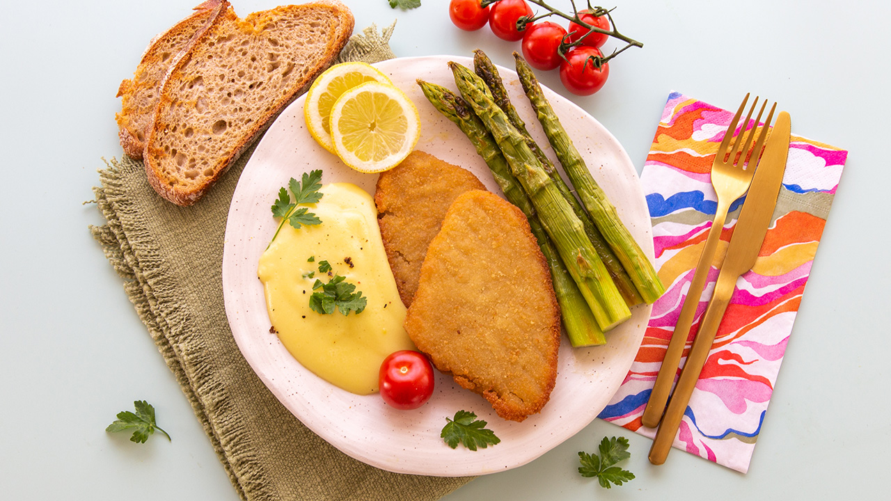 Wasser, PANIERMEHL (WEIZENMEHL, Salz, Hefe), Sonnenblumenöl, Maisöl, WEIZENPROTEIN (7,5 %), WEIZENSTÄRKE, WEIZENMEHL, modifizierte WEIZENSTÄRKE, Verdickungsmittel: Methylcellulose; natürliches Aroma, Zuckerrohrfasern, Erbsenproteinisolat, Maisstärke, Branntweinessig (AT: Weingeistessig), Salz, Zwiebelpulver, Kräuter, Gewürze, Eisendiphosphat, Cyanocobalamin.