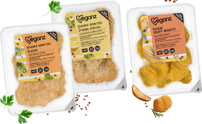 Peas on Earth Erbsen-Chunks Peas on Earth Erbsen-Hack Peas on Earth Erbsen-Steaks Veganes Schnitzel Klassik Veganes Schnitzel Zitrone-Pfeffer Vegane Crispy Nuggets Unsere Peas on Earth Erbsen-Chunks sind nicht nur kulinarisch ein Highlight, sondern auch ein richtiges Protein Power-Bündel! Ob in Sandwiches, Tacos, Burgern oder Wraps – die Möglichkeiten sind endlos: Probier’s aus und entdecke die Welt der veganen Vielfalt! Nährwerte Durchschnittliche Nährwerte je 100 g Brennwert 1625 kJ 385 kcal Fett 8.7 g - davon gesättigte Fettsäuren 1.7 g Kohlenhydrate 1.9 g - davon Zucker 0.7 g Eiweiß 75 g Salz 2 g Zutaten Erbsenprotein (100%). Kann Spuren von GLUTENHALTIGEM GETREIDE enthalten. Nachhaltig DevStage DevStage DevStage Hier erhältlich Globus | DE EDEKA | DE REWE | DE Mehr zeigen Eine Fleischalternative, unendliche Möglichkeiten: Ob als Roulade oder in einer würzigen Kräutermarinade eingelegt, unsere Peas on Earth Erbsen-Steaks sind die perfekte Basis für deine kulinarischen Experimente – deiner Kreativität sind keine Grenzen gesetzt. Probier’s aus! Nährwerte Durchschnittliche Nährwerte je 100 g Brennwert 1548 kJ 367 kcal Fett 6.6 g - davon gesättigte Fettsäuren 1.3 g Kohlenhydrate 1.7 g - davon Zucker 0.6 g Eiweiß 74 g Salz 2.1 g Zutaten Erbsenprotein (95%), Erbsenfaser. Kann Spuren von GLUTENHALTIGEM GETREIDE enthalten. Nachhaltig Liebe fürs Klima Ganz transparent: Das ist der Fußabdruck von den Peas on Earth Erbsen-Steaks Saftig, chewy und ganz nach deinem Belieben herzhaft gewürzt – so schmecken die Erbsen-Steaks von Veganz. Mit jeder Packung erhältst du fünf Steaks, die in Wasser oder Brühe eingelegt ein halbes Kilo Fleisch-Alternative ergeben. Die veganen Steaks werden in unserer eigenen Produktion in der Nähe von Berlin ausschließlich aus europäischen Erbsen hergestellt und sind proteinrech und als Trockenprodukt platzsparend und besonders lange haltbar. Perfekt also, um sie immer auf Lager zu haben! Dein neuer Lieblings-Fleischersatz ist aber nicht nur super praktisch und lecker – sondern auch extra nachhaltig. Denn wie der Nachhaltigkeits-Score von Eaternity beweist, schneiden die Erbsen-Steaks im Vergleich mit vielen ähnlichen Produkten in den Kategorien Tierwohl, Regenwaldschutz, CO2-Ausstoß und Wasserverbrauch überdurchschnittlich gut ab. In allen diesen Kategorien erhalten die Peas on Earth Erbsen-Steaks 3/3 Sternen – nichts zu meckern, also! Nach dem Genuss bleibt noch die Verpackung aus… Plastik?! Zurzeit ist es uns leider noch nicht möglich, unsere veganen Fleisch-Alternativen in einer nachhaltigeren Verpackung anzubieten. Wir verwenden aber für die Erbsen-Steak-Verpackung so wenig Kunststoff wie möglich. Und über den gelben Sack kannst du den Beutel ganz einfach recyceln! Hier erhältlich Globus | DE EDEKA | DE Mehr zeigen Unser Life-Hack für vegane Lasagne, Bolognese oder Chili sin Carne: Das Peas on Earth Erbsen-Hack. Mit unserer Rindfleischalternative lassen sich all deine heißgeliebten Gerichte im Nu veganisieren. Probiere es aus und überzeuge dich selbst. Nährwerte Durchschnittliche Nährwerte je 100 g Brennwert 1647 kJ 390 kcal Fett 7.6 g - davon gesättigte Fettsäuren 1.5 g Kohlenhydrate 5.9 g - davon Zucker 0.6 g Eiweiß 74 g Salz 2.6 g Zutaten Erbsenprotein (96%), GERSTENMALZEXTRAKT, Aroma. 🛈 Hier erhältlich shop.veganz.com Puroshop | CZ Rohlik | CZ AEZ / HIT | DE Globus | DE EDEKA | DE REWE | DE Mehr zeigen Du bist schon lange auf Schnitzeljagd nach dem knusprigsten, saftigsten und einfach leckersten veganen Schnitzel? Herzlichen Glückwunsch, du hältst den Schatz in deinen Händen – unser Veganz VEGANES SCHNITZEL KLASSIK. Nährwerte Durchschnittliche Nährwerte je 100 g Brennwert 1145 kJ 274 kcal Fett 15 g - davon gesättigte Fettsäuren 1.6 g Kohlenhydrate 22 g - davon Zucker 0.4 g Eiweiß 12 g Salz 1.1 g Eisen 2.2 g Vitamin B12 0.55 g Zutaten Wasser, PANIERMEHL (WEIZENMEHL, Salz, Hefe), Sonnenblumenöl, Maisöl, WEIZENPROTEIN (7,5 %), WEIZENSTÄRKE, WEIZENMEHL, modifizierte WEIZENSTÄRKE, Verdickungsmittel: Methylcellulose; natürliches Aroma, Zuckerrohrfasern, Erbsenproteinisolat, Maisstärke, Branntweinessig (AT: Weingeistessig), Salz, Zwiebelpulver, Kräuter, Gewürze, Eisendiphosphat, Cyanocobalamin. 🛈 Hier erhältlich REWE | DE AEZ / HIT | DE kokku-online.de | DE Spar | AT Spar | SI Amazon Fresh Vekoop | DE Coop | DK EDEKA | DE MPREIS Italia | IT Mehr zeigen Wenn dir das Leben Zitronen schenkt… dann solltest du die auch noch pfeffern! Und das schmeckt wirklich richtig klasse. Zum Beispiel in unserem Veganz VEGANES SCHNITZEL ZITRONE-PFEFFER – innen saftig und außen wunderbar knusprig. Mmmmh… Nährwerte Durchschnittliche Nährwerte je 100 g Brennwert 1088 kJ 260 kcal Fett 13 g - davon gesättigte Fettsäuren 1.5 g Kohlenhydrate 21 g - davon Zucker 0.4 g Eiweiß 12 g Salz 1 g Eisen 2.1 g Vitamin B12 0.54 g Zutaten Wasser, PANIERMEHL (WEIZENMEHL, Salz, Hefe), Sonnenblumenöl, Maisöl, WEIZENPROTEIN (7,2 %), WEIZENMEHL, WEIZENSTÄRKE, modifizierte WEIZENSTÄRKE, natürliches Aroma, Zuckerrohrfasern, Erbsenproteinisolat, Verdickungsmittel: Methylcellulose; Maisstärke, Stabilisator: Methylcellulose; Branntweinessig (AT: Weingeistessig), Zitronensaft (0,67 %), Salz, Gewürze, Zwiebelpulver, Pfeffer schwarz (0,23 %), Knoblauch, natürliches Zitronenaroma (0,07 %), Kräuter, Eisendiphosphat, Cyanocobalamin. 🛈 Hier erhältlich AEZ / HIT | DE REWE | DE kokku-online.de | DE Spar | AT Spar | SI Amazon Fresh Vekoop | DE EDEKA | DE MPREIS Italia | IT Mehr zeigen Goldene Zeiten brechen an mit unseren Veganz VEGANEN CRISPY NUGGETS. Sie sind unglaublich saftig und haben eine super leckere Knusperpanade. Neben denen möchte wirklich jede Beilage liegen, zum Beispiel unsere Veganz Sandwichcremes Klassik und Dänische Art. Nährwerte Durchschnittliche Nährwerte je 100 g Brennwert 1042 kJ 249 kcal Fett 12 g - davon gesättigte Fettsäuren 1.3 g Kohlenhydrate 21 g - davon Zucker 1.6 g Eiweiß 13 g Salz 1