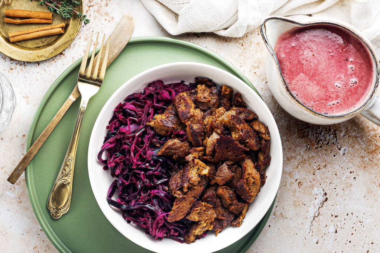 Apfelrotkohl mit krosser veganer Ente & Preiselbeer-SauceMit den Veganz Gourmetstücken wie Ente Nicht lang stressen, hier gibt’s das perfekte vegane Festtagsessen: Apfelrotkohl mit krosser veganer Ente & Preiselbeer-Sauce à la Veganz. Und sind wir mal ehrlich, dieser Klassiker eignet sich nicht nur für besondere Anlässe, sondern passt einfach immer, wenn sich das deftig-herzhafte Hüngerchen anschleicht. Zutaten (2 Personen) ¼ Rotkohl ½ Speisezwiebel 20 g vegane Butter ½ Zwiebel 100 ml Rotwein ½ Orange 1 Apfel 2 Zweig(e) Rosmarin, frisch 4 Zweig(e) Thymian, frisch 350 g Veganz Gourmetstücke Wie Ente 40 g Wild-Preiselbeeren, im Glas 50 ml Wasser 1 EL Agavendicksaft ½ Zimtstange Zimt, gemahlen 3 Nelken 100 ml Gemüsebrühe 1 ½ EL Olivenöl 1 ½ Sojasauce Salz Pfeffer Portionen Personen: Alles parat? Dann los! Zwiebel schälen und fein würfeln. Apfel waschen und reiben. Etwas vegane Butter in einem Topf schmelzen, Apfel und Zwiebeln 5 min. anschwitzen. Rotkohl waschen und in feine Streifen schneiden. Rotkohl zu Zwiebeln und Apfel in den Topf geben. Wasser, Agavendicksaft und einige Nelken hinzugeben. Mit Zimt, Salz und Pfeffer würzen und 15-20 min. köcheln lassen. Währenddessen rote Zwiebel schälen und fein würfeln. Restliche Butter und etwas Olivenöl in einem zweiten Topf erhitzen und rote Zwiebelwürfel, Zimtstange und übrige Nelken 3-4 min. bei mittlerer Hitze anschwitzen. In der Zwischenzeit Orange gründlich mit heißem Wasser waschen und Schale abreiben. Halbieren und Saft auspressen. Nelken aus dem Topf nehmen und Rotwein, Gemüsebrühe, Orangensaft und -abrieb mit Wildpreiselbeeren zu den Zwiebeln geben und zum Kochen bringen. Anschließend bei mittlerer Hitze 7-8 min. köcheln lassen. Mit Salz und Pfeffer würzen. Währenddessen Öl in einer Pfanne erhitzen und vegane Ente mit gewaschenem Rosmarin und Thymian nach Packungsanleitung 5 min. knusprig braten. Anschließend Sojasauce in die Pfanne hinzugeben und köcheln, bis die Sauce aufgenommen ist. Mit Pfeffer würzen. Zimtstange aus dem Topf nehmen und Preiselbeer-Sauce mit einem Pürierstab cremig pürieren. Apfelrotkohl mit veganer Ente und Preiselbeer-Sauce servieren und genießen. Quelle Rezept von: KptnCook KptnCook unterstützt dich dabei, jeden Tag in kurzer Zeit ein gesundes Abendessen zuzubereiten. Dabei begleitet dich die praktische App Schritt für Schritt bei deinem Kochabenteuer: Von der Rezept-Inspiration über den Einkauf im Supermarkt bis hin zum Kocherlebnis. Dabei soll das Kochen möglichst einfach, spontan & stressfrei von der Hand gehen. Jetzt mehr KptnCook erfahren. Quelle: KptnCook Copyright: KptnCook