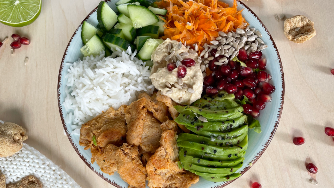 Vegane Buddha Bowl Frisch, leicht, sommerlich und ausgewogen. Das ist unsere leckere und klimafreundliche Buddha Bowl. Sie ist nicht nur optisch ein echter Hingucker, sondern glänzt auch mit ihren inneren Werten. Denn die Bowl beinhaltet gesunde Leckereien mit einigen Vitaminen und anderen Nährstoffen. Was ist eigentlich eine Buddha Bowl? Die Bowl erinnert an den satten und runden Bauch des Buddha. Sie macht dich glücklich und satt, daher kommt auch der Name. Die Buddha Bowl wird auch Nourishment Bowl genannt, denn sie deckt deinen Bedarf an wichtigen Nährstoffen wunderbar ab. Dabei kannst du sie ganz nach deinem Geschmack gestalten, egal ob warm oder kalt, mit Paprika oder Gurke – bei deiner Bowl kannst du dich kreativ austoben. Das Grundrezept Die Buddha Bowl besteht aus verschiedenen Teilen. Die Basis bildet Salat. Du hast die Wahl zwischen allen möglichen Salatarten wie Rucola oder Feldsalat und vielen mehr. Du entscheidest, was in deine Bowl kommt! Danach kommt gesundes Getreide bzw. komplexe Kohlenhydrate wie z.B. Süßkartoffeln, Hirse, Mais oder Quinoa hinzu. Was darf bei einer Bowl außerdem niemals fehlen? Richtig! Gemüse! Also pack deine Favoriten einfach mit rein, egal ob warm oder kalt, gekocht, gebraten oder roh. Ein weiterer wichtiger Bestandteil sind Proteine. Wir benutzen in unserem Rezept die Veganz Soja-Medaillons. Dazu braten wir sie schön knusprig in einer Pfanne an. Du kannst dich aber auch für Linsen, Tofu oder ähnliches entscheiden. Für die gesunden Fette kannst du z.B. Nüsse und Avocado nutzen. Toppings deiner Wahl obendrauf und fertig ist deine Buddha Bowl! Zusammengefasst besteht die Buddha Bowl aus diesen Komponenten: Salatbasis: Feldsalat, Rucola, Spinat, Basilikum… Getreide: Quinoa, Mais, Vollkornnudeln, Couscous, Hirse… Gemüse: Paprika, Gurke, Rote Beete, Radieschen, Tomate… Proteine: Veganz Soja-Medaillons, Tofu, Veganz Soja-Schnetzel, Edamame, Linsen… Gesunde Fette: Avocado, Nüsse, Samen… Früchte: Weintrauben, Granatapfelkerne, Erdbeeren, Birne… Toppings: Sprossen, Kerne, Veganz Geniesserstück… Zutaten (1 Portion) Eine Handvoll Salat 40 g Reis ½ kleine Gurke 1 Möhre 40 g Veganz Soja-Medaillons ½ Avocado 1 EL Granatapfelkerne 1 EL Sonnenblumenkerne 2 EL Hummus Salz, nach Bedarf Paprikapulver, nach Bedarf Knoblauchpulver, nach Bedarf Öl, zum Anbraten Portionen Portion: Die Veganz Soja-Medaillons in Wasser einlegen und für 10 Minuten ziehen lassen. Danach die überschüssige Flüssigkeit ausdrücken und die Soja-Medaillons in einer Pfanne mit etwas Öl, Salz, Knoblauchpulver und Paprikapulver anbraten. In der Zwischenzeit den Reis nach Packungsanleitung kochen. Den Salat, die Gurke, die Avocado und die Möhre kleinschneiden und zusammen mit den restlichen Zutaten in eine Schüssel geben. Guten Appetit!