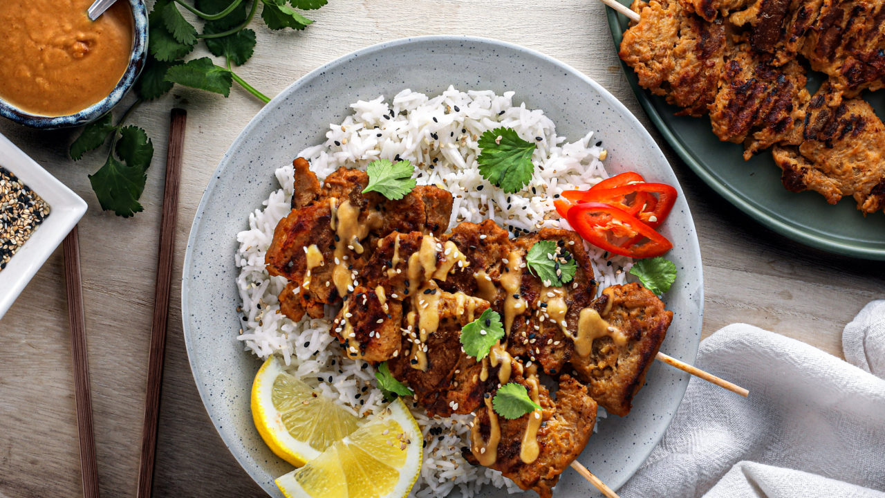 Vegane Satéspieße mit ErdnusssauceMit den Veganz Soja-Medaillons Das läuft ja wie am Spießchen! Ergattere das Rezept für unsere veganen Satéspieße mit Erdnusssauce mit den Soja-Medaillons von Veganz. Na, hast du jetzt Hunger bekommen? Zutaten (2 Personen) 5 g Currypaste, rot 100 g Veganz Soja-Medaillons 120 g Basmati Reis 1 ½ Zitronen Sesamsaat, schwarz 10 g Koriander, frisch ¼ Chilischote 45 g Erdnussbutter 1 L Gemüsebrühe 4 EL Sojasauce 4 TL Agavendicksaft 1 EL Reisessig 4 EL Wasser 2 Zehe(n) Knoblauch 2 EL Sesamöl 4 Holzspieße Portionen Personen: Alles parat? Dann los! Holzspieße ca. 15 min. in Wasser einweichen lassen. Gemüsebrühe kochen, Veganz Soja-Medaillons hinzufügen und 15 min. einweichen. Knoblauch schälen und reiben. 1/2 Knoblauch in eine Schüssel geben und mit Currypaste, Reisessig, Wasser, etwas Erdnussbutter, Agavendicksaft und Sojasauce mischen. Medaillons abgießen und Flüssigkeit ausdrücken, mit Marinade mischen und ca. 10 min. zur Seite stellen. Reis nach Packungsanleitung kochen. Zitrone halbieren und Saft auspressen. Koriander waschen, trocken schütteln und Blätter abzupfen. Chili waschen, entkernen und fein würfeln. Zitronensaft, restliche Erdnussbutter, Knoblauch, Agavensirup und Sojasauce sowie Wasser in einer kleinen Schüssel mischen. Medaillons auf die Spieße stecken. Sesamöl in einer Grillpfanne erhitzen und Spieße von beiden Seiten ca. 5-6 min. knusprig braten. Satéspieße auf einem Teller mit Basmatireis, Koriander, frischer Chili, Zitronenspalten und Sesamsamen garnieren und mit Satésauce genießen. Quelle Rezept von: KptnCook KptnCook unterstützt dich dabei, jeden Tag in kurzer Zeit ein gesundes Abendessen zuzubereiten. Dabei begleitet dich die praktische App Schritt für Schritt bei deinem Kochabenteuer: Von der Rezept-Inspiration über den Einkauf im Supermarkt bis hin zum Kocherlebnis. Dabei soll das Kochen möglichst einfach, spontan & stressfrei von der Hand gehen. Jetzt mehr KptnCook erfahren. Quelle: KptnCook Copyright: KptnCook