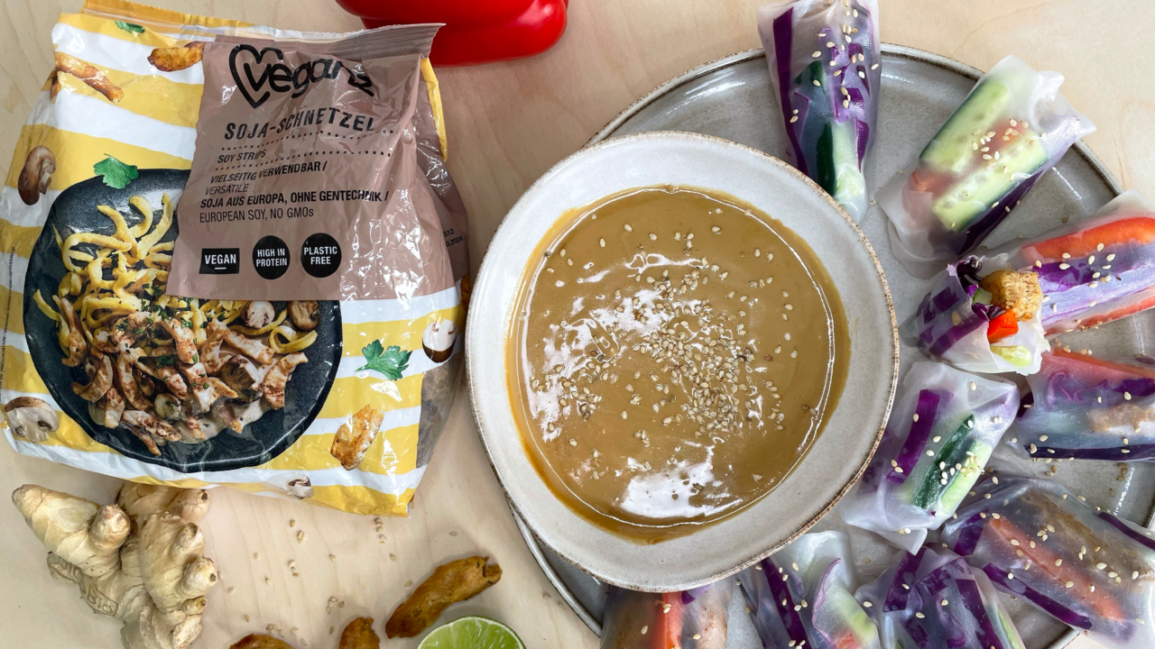 Vegane Sommerrollen mit Erdnusssauce Das ideale Sommerfood? Der Name spricht für sich: Vegane Sommerrollen mit Erdnusssauce. Die mit knackigem Gemüse und zarten Veganz Soja-Schnetzel gefüllten Rollen eignen sich perfekt für die heißen Tage, denn sie werden kalt gegessen und sind voller frischer Zutaten. Egal, ob für das Picknick im Park, den Freund:innen-Abend oder als Snack für Zwischendurch: Der vietnamesische Küchenklassiker passt einfach immer. Eingetunkt wird die vegane Vorspeise in eine cremige, selbstgemachte Erdnusssauce. Frühlingsrolle vs. Sommerrolle Die frittierte Frühlingsrolle kennst du bestimmt schon von deinem Lieblings-Asia-Imbiss, aber was sind eigentlich Sommerrollen? Sommerrollen haben statt der speziellen Teigblätter als Mantel eine Hülle aus in Wasser eingeweichten Reisoblaten. Damit sind sie viel bekömmlicher als ihre frittierten Kollegen und liegen nicht so schwer im Magen. Da die Sommerrolle kalt serviert wird, ist sie ein ideales Sommerfood. In unserem Rezept gibt’s dazu eine flotte Erdnusssauce als Dip, aber du kannst die gemüsige Rolle auch in Sojasauce oder einen anderen Dip deiner Wahl tunken und genießen. Zubereitung der veganen Sommerrolle Die Sommerrolle besteht aus Reispapier, das mit frischen Zutaten deiner Wahl gefüllt und anschließend zu einer Rolle gedreht wird. Fülle die Rolle mit deinen Lieblingszutaten: Die Basis bilden Reisnudeln und Salat. Gemüse und Kräuter wie Möhre, Gurke, Mango oder Sprossen sowie Koriander und Basilikum machen den asiatischen Snack perfekt. Bei der nicht-veganen Variante werden häufig Fleisch, Fisch oder Garnelen verwendet. Gebackener Tofu oder Seitan nach Art eines Entenfilets landen dagegen oftmals in der veganen Variante der Sommerrolle. In unserem Rezept kommt anstelle dessen aber das knusprig angebratene Veganz Soja-Schnetzel zum Einsatz. Unser Veganz Soja-Schnetzel hat im Vergleich zu 100.000 anderen Produkten einen sehr geringen Wasserverbrauch und CO2-Ausstoß und wird zudem in der Donau-Region im nahen Serbien angebaut. Somit schützt du mit dem Schlemmen dieser veganen Sommerrollen sowohl Tiere, Klima als auch den Regenwald! Zutaten (2 Portionen) Für die Sommerrollen 100 g Veganz Soja-Schnetzel 15 Stück Reispapier ¼ Rotkohl ½ Gurke 1 Paprika 1 EL Sesam Öl, zum Anbraten 500 ml Gemüsebrühe Für die Erdnusssoße 70 g Erdnussmus 1 EL Sojasauce 1 EL Kokosblütenzucker 1 Knoblauchzehe Ingwer, frisch ½ EL Reisessig 2 EL Kokosmilch Saft einer halben Limette 3 EL Wasser Portionen Portionen: Die Veganz Soja-Schnetzel mit 500 ml kochender Gemüsebrühe übergießen und ca. 10 Minuten ziehen lassen. Danach die Soja-Schnetzel ausdrücken und in einer Pfanne mit Öl scharf und knusprig anbraten. In der Zwischenzeit den Rotkohl, die Gurke und die Paprika in längliche Streifen schneiden. Das Reispapier wird kurz in Wasser eingetaucht und anschließend mit dem Gemüse, dem abgekühltem Veganz Soja-Schnetzel und etwas Sesam gefüllt. Um die Sommerrolle zu schließen, lege die Zutaten am besten in die Mitte, klappe dann die Seiten ein und rolle die Reisoblate von der langen Seite vorsichtig auf. Für den Erdnussdip den Ingwer und den Knoblauch kleinhacken und danach mit allen weiteren Zutaten vermengen, sodass eine cremige Masse entsteht. Als Deko noch etwas Sesam und dann kannst du auch schon deine veganen Sommerrollen eintunken und genießen.