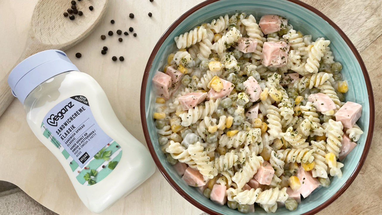Klassischer Nudelsalat mit veganer Fleischwurst Du suchst noch nach einer einfachen und gleichzeitig superleckeren Beilage für dein BBQ? Dann haben wir das perfekte Rezept für dich! Dieser klassische Nudelsalat ist vegan, schnell gemacht und geschmacklich auch für Opa Werner und Tante Gertrud 1A mit Sternchen. Läute mit uns die Grillsaison ein und zeig, wie einfach und lecker vegan Grillen sein kann. Mit im Gepäck: Die Veganz Sandwichcreme nach Art einer Mayonnaise in der praktischen Squeeze-Flasche und die Vegane Fleischwurst als herzhafte Zutat. Mmh, freue dich auf Nudelsalat wie von Oma. Klassischen Nudelsalat im Handumdrehen veganisiert Mit Hilfe von nur wenigen Handgriffen lässt sich fast jedes Gericht einfach veganisieren. Auch der klassische Nudelsalat von Mama oder Oma im Hausmannskost Style ist im Handumdrehen rein pflanzlich zubereitet. Die Mayo mit Ei wird einfach fix durch unsere Veganz Sandwichcreme Klassik ersetzt und die Fleischwurst muss ebenfalls Platz machen für unsere vegane Fleischalternative auf Basis von Erbsen- & Kartoffelprotein. Das Großartige: Dieser veganisierte Nudelsalat-Klassiker schmeckt mindestens genauso gut wie sein milch- und fleischhaltiger Kollege, tut aber gleichzeitig noch etwas für unsere Umwelt und sorgt dafür, dass kein Tier zu Schaden kommt! Grill-Must-Haves am BBQ Tisch Auf dem bunt gedecktem BBQ Tisch darf niemals fehlen: Die Veganz Sandwichcreme Klassik oder Dänische Art. Die vegane Creme a la Mayo harmoniert nicht nur super im Nudel- oder Kartoffelsalat, sondern ist auch der ultimative Dip für die herzhaften Veganz Bratgriller oder für dein krosses Knoblauchbrot direkt vom Grill. Aromen haben in unserer veganen Mayo übrigens nichts zu suchen, den typischen Geschmack bekommen wir auch gut ohne hin. MyOhlicious, diese pflanzlichen Cremes sind einfach das Nonplusultra im Salat. Versprochen! Zutaten (6 Portionen) 500 g Fusilli bzw. Nudeln nach deiner Wahl 175 g Veganz Vegane Fleischwurst 185 g Mais, aus der Dose 280 g Erbsen, aus der Dose 150 ml Veganz Sandwichcreme Klassik 500 g Sojajoghurt, Natur Salz, nach Bedarf Pfeffer, nach Bedarf Petersilie, frisch 1 Packung Veganz Bratgriller Die Originale oder Veganz Bratgriller Die Pikante, nach Bedarf Portionen Portionen: Zu Beginn die Nudeln in Salzwasser nach Packungsanleitung ca. 8-10 Minuten kochen. In der Zwischenzeit die Veganz Vegane Fleischwurst in Würfel schneiden. Die fertig gekochten Nudeln abgießen und abtropfen lassen. Sobald die Nudeln abgekühlt sind, in einer Schüssel mit der veganen Fleischwurst, dem Mais, den Erbsen, dem Sojajoghurt und der Veganz Sandwichcreme Klassik vermengen. Abschließend das Ganze nach Bedarf mit Salz, Pfeffer und Petersilie würzen. Den Nudelsalat für mindestens eine Stunde im Kühlschrank ziehen lassen bzw. im besten Falle schon am Tag vorher zubereiten und über Nacht alles gut durchziehen und die Gewürze arbeiten lassen. Guten Appetit!